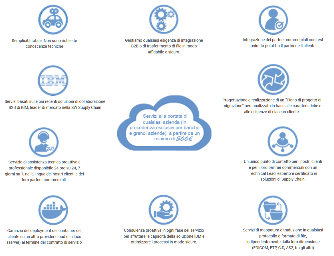 Attraverso il nostro servizio Cloud, basato sull’ultima tecnologia IBM e su Kubernetes, siamo in grado di interconnettere, con la massima affidabilità, la sua azienda con la rete dei suoi partner commerciali, indipendentemente dalle preferenze in termini di protocolli di comunicazione e formati di file.