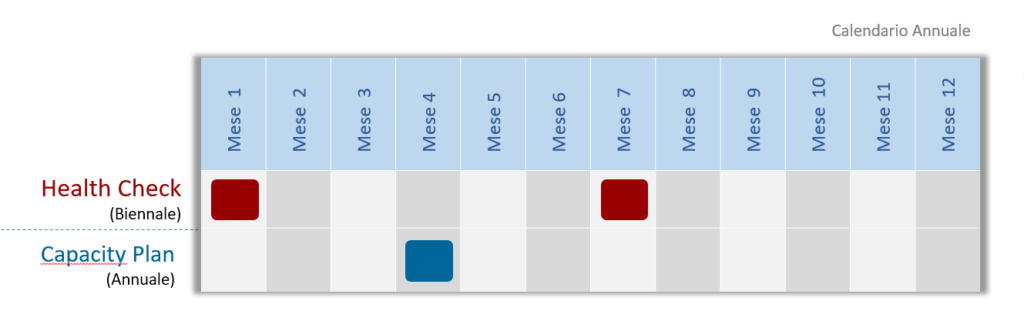 Il servizio, strutturato in cicli annuali rinnovabili, inizia con un completo Health Check per valutare lo stato della piattaforma e effettuare una prima messa a punto. Il programma annuale prevede un secondo intervento di Health Check, oltre a uno studio di Capacity Plan per apportare modifiche in base ai requisiti di crescita.