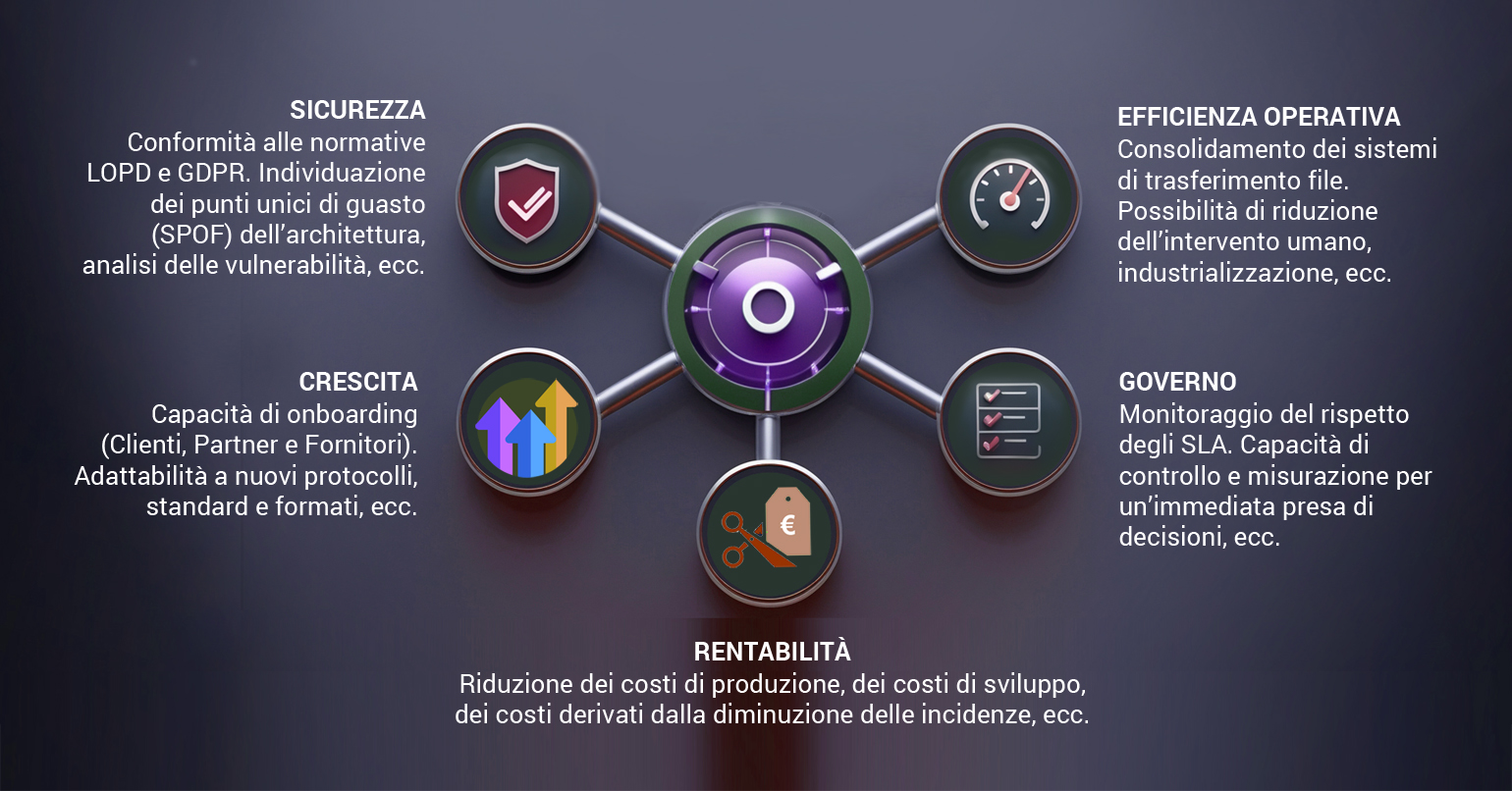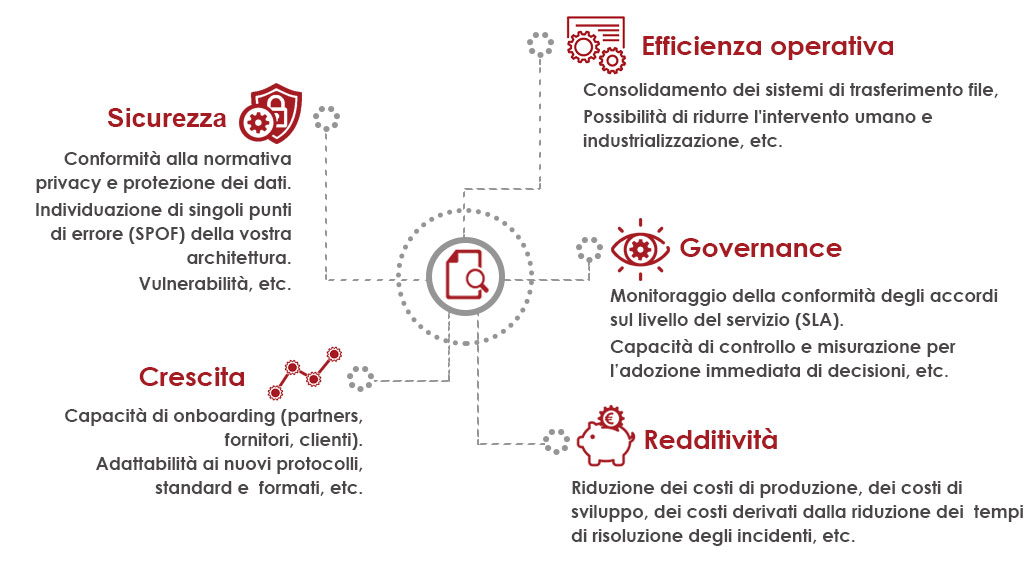 Una soluzione adeguata per il trasferimento dei file facilita solitamente un rapido ritorno sull’investimento (ROI), consentendo al contempo un pieno allineamento con il business della tua azienda, migliorando la qualità del servizio e la soddisfazione dei Clienti.